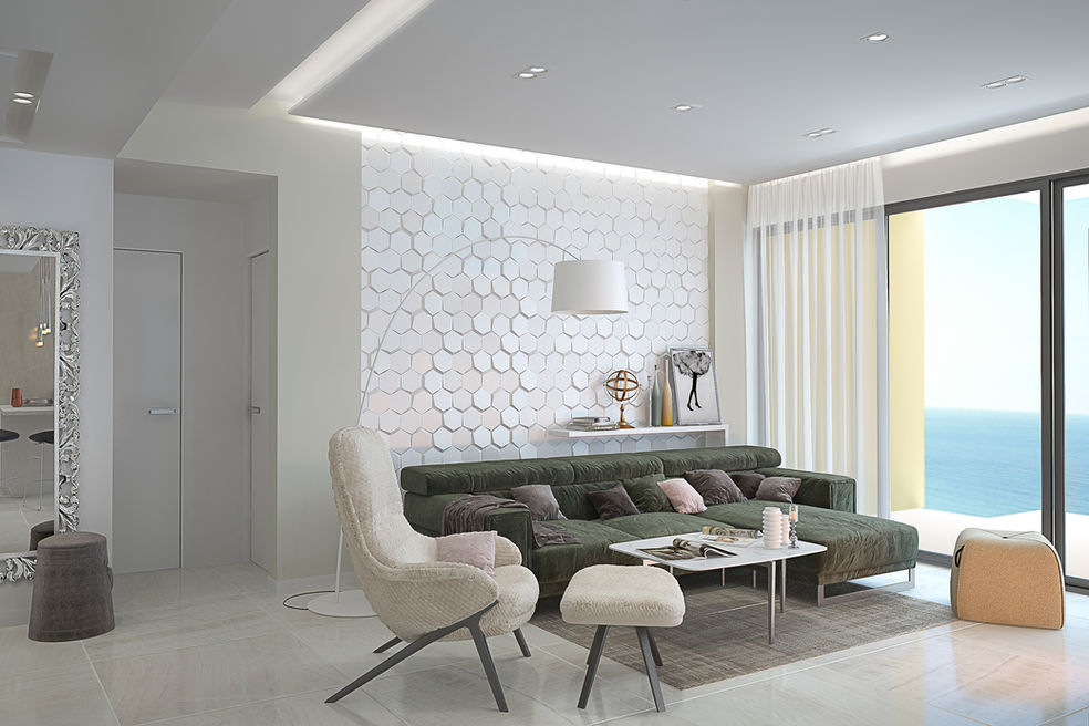 הדירה ממוקמת בקומה 36 המשקיפה על הים ומיועדת לשהייה זמנית של משפחה צעירה בישראל במהלך חופשות הקיץ. עיצוב הפנים יצא אלגנטי, לקוני, בגוונים חמים וסגנון מודרני.